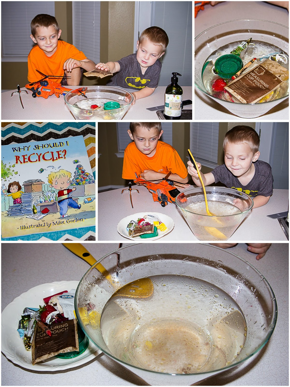 Thanks to my friend, Annick, we made a sensory bucket (dish) out of green gel beads, random halloween decorations, cupcake papers, cookie cutters and the boys had fun playing with those. The beads feel so weird, almost slimy, they love them.